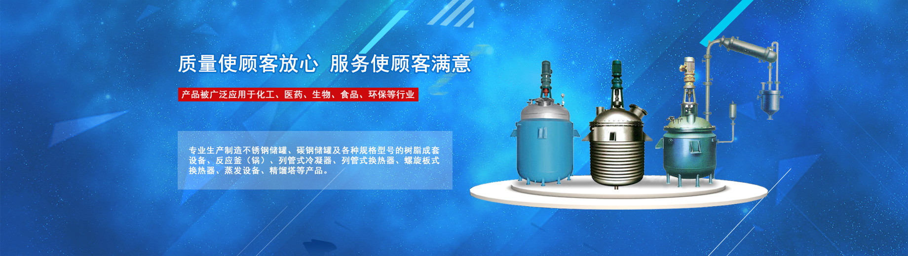 公司專業(yè)生產(chǎn)制造不銹鋼儲(chǔ)罐、碳鋼儲(chǔ)罐及各種規(guī)格型號(hào)的樹脂成套設(shè)備、反應(yīng)釜(鍋)、列管式冷凝器、列管式換熱器、螺旋板式換熱器、蒸發(fā)設(shè)備、精餾塔等產(chǎn)品,被廣泛應(yīng)用于化工、醫(yī)藥、生物、食品、環(huán)保等行業(yè)。